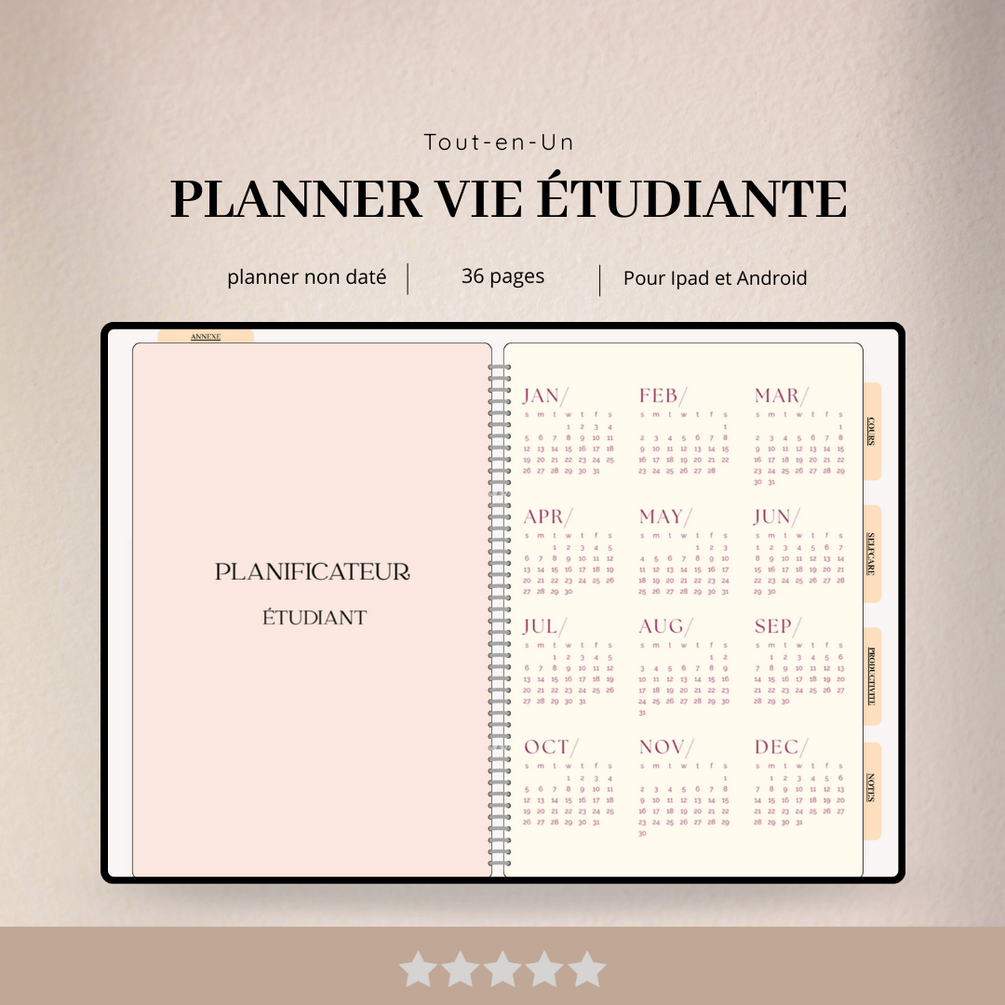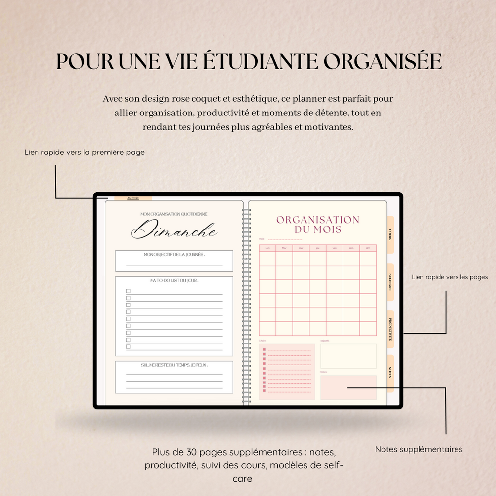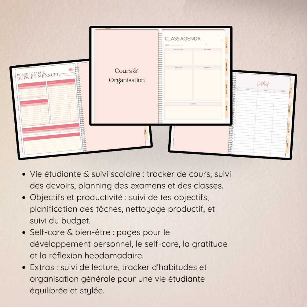 - Extras : suivi de lecture, tracker d’habitudes et organisation générale pour une vie étudiante équilibrée et stylée.+Les liens interactifs du PDF permettent de circuler facilement entre les pages