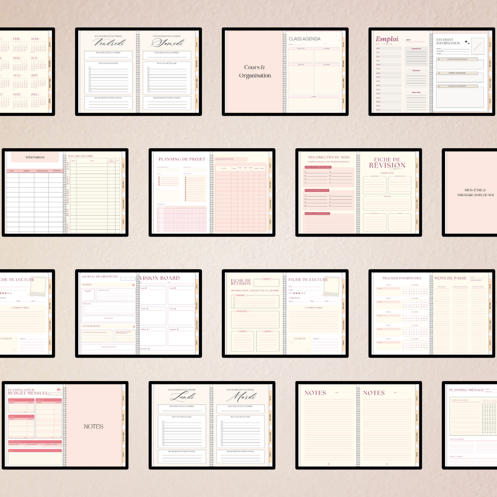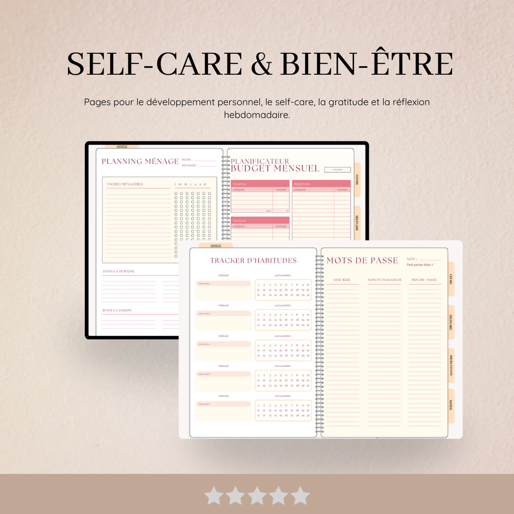 - Self-care & bien-être : pages pour le développement personnel, le self-care, la gratitude et la réflexion hebdomadaire.