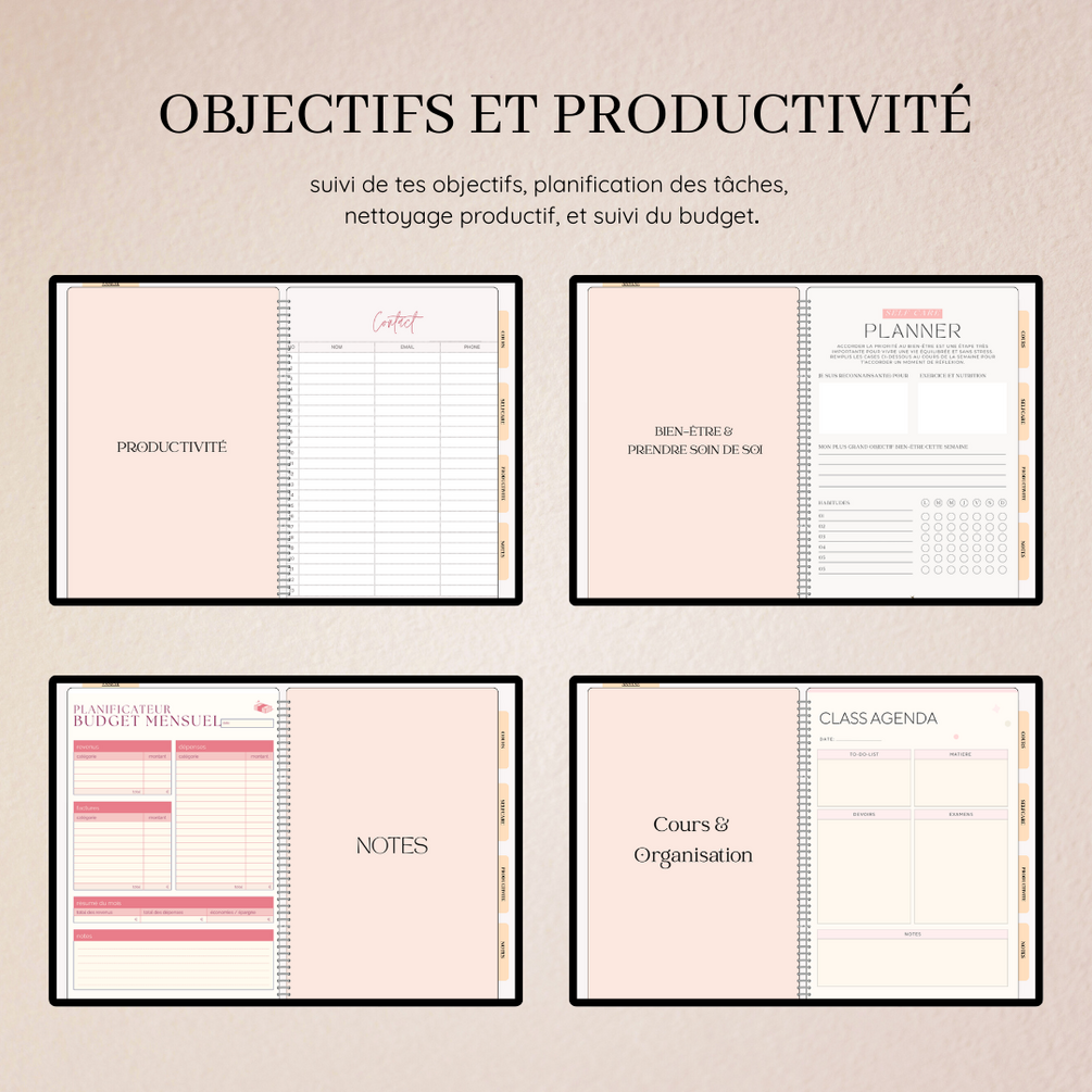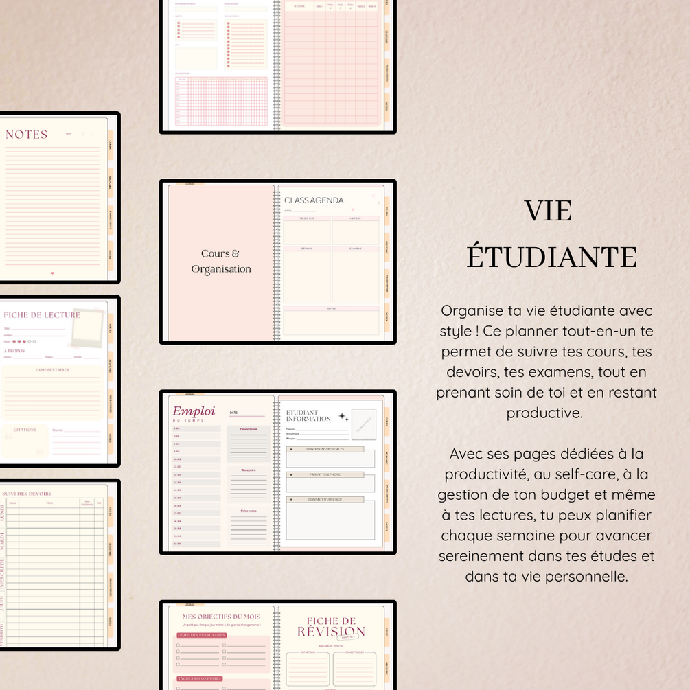 Organise ta vie étudiante avec style ! Ce planner tout-en-un te permet de suivre tes cours, tes devoirs, tes examens, tout en prenant soin de toi et en restant productive. Avec ses pages dédiées à la productivité, au self-care, à la gestion de ton budget et même à tes lectures, tu peux planifier chaque semaine pour avancer sereinement dans tes études et dans ta vie personnelle.