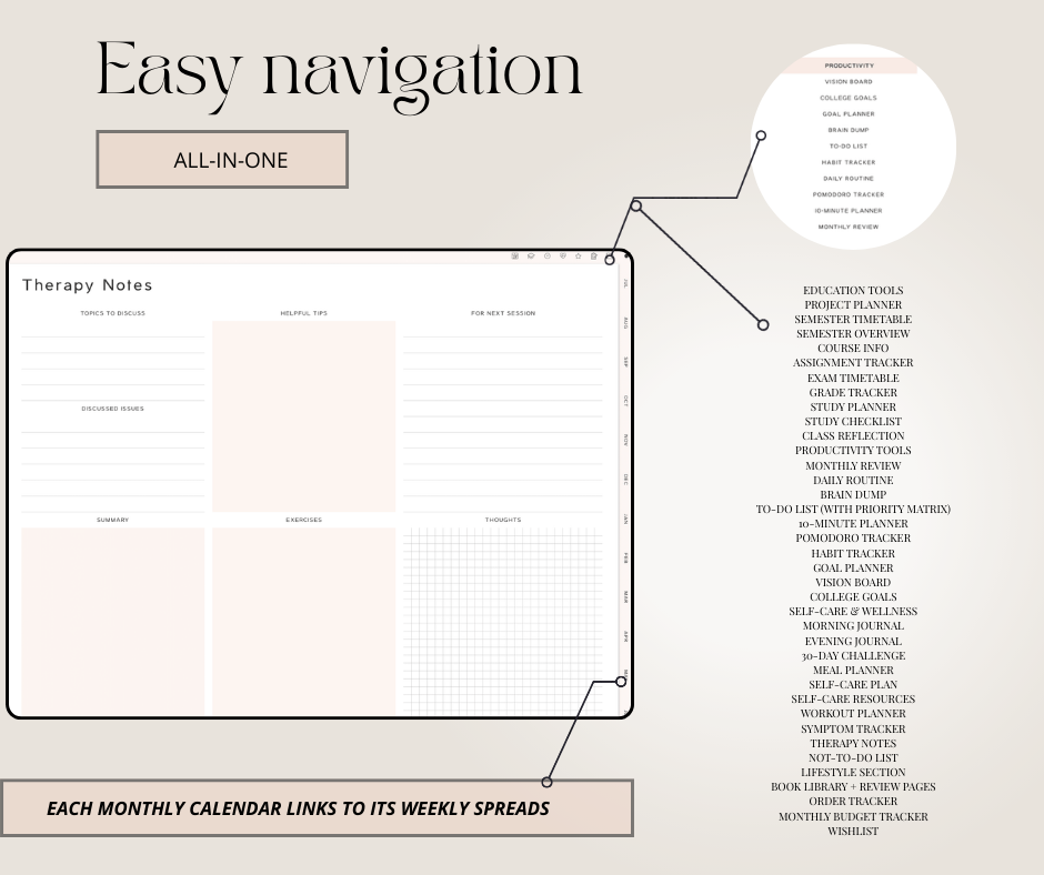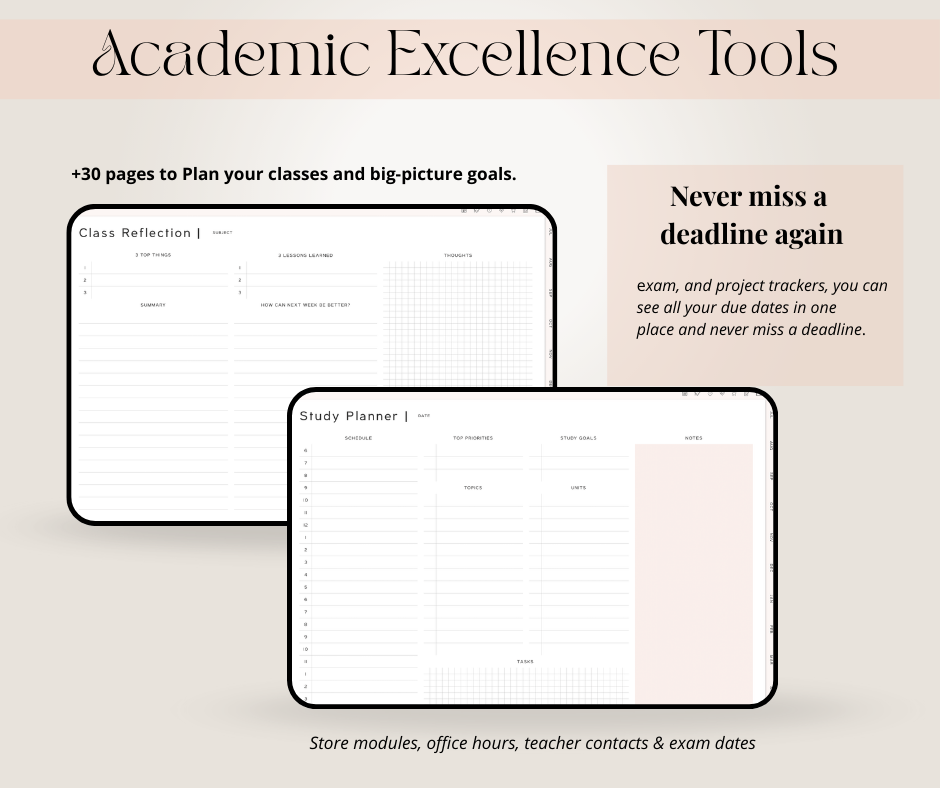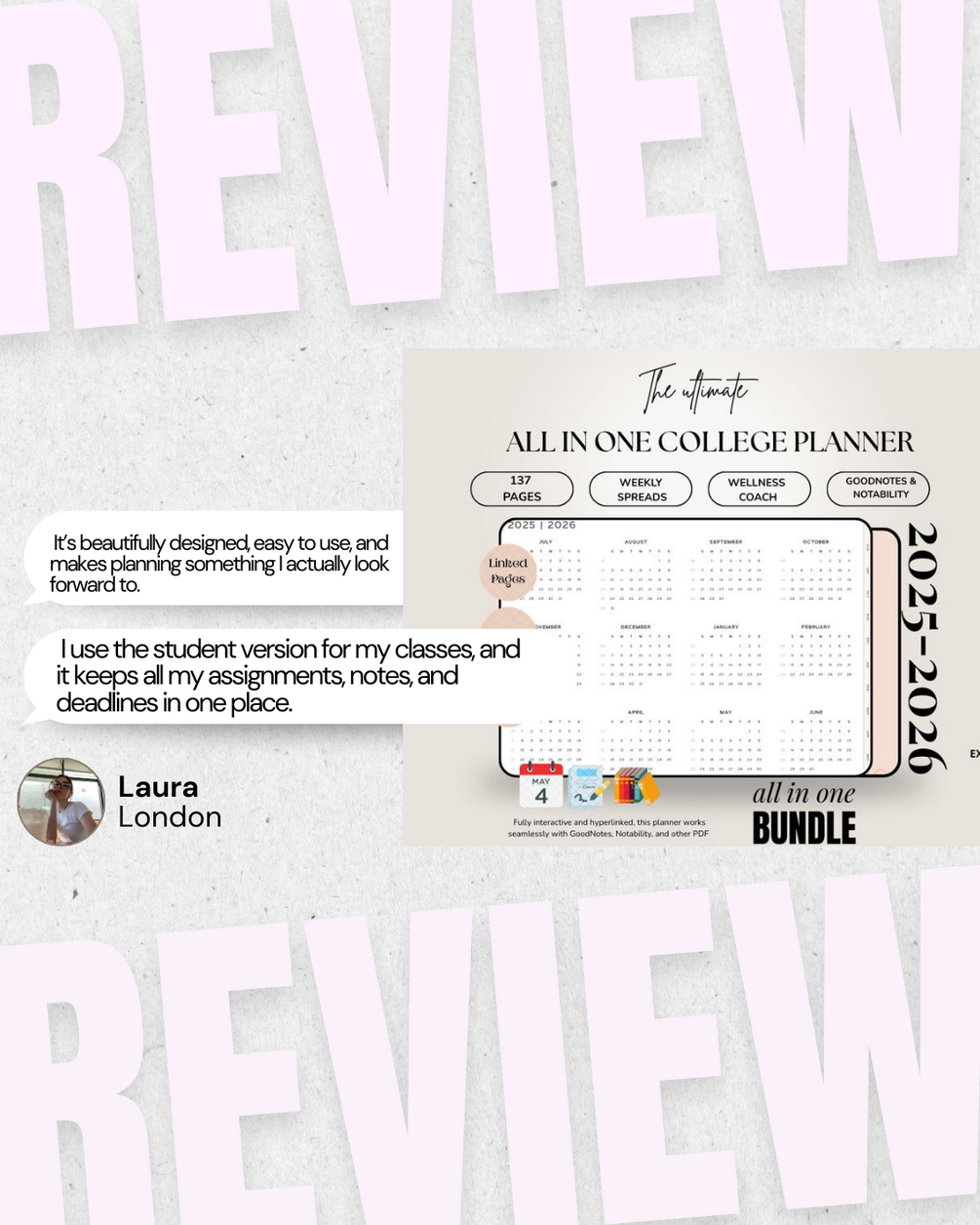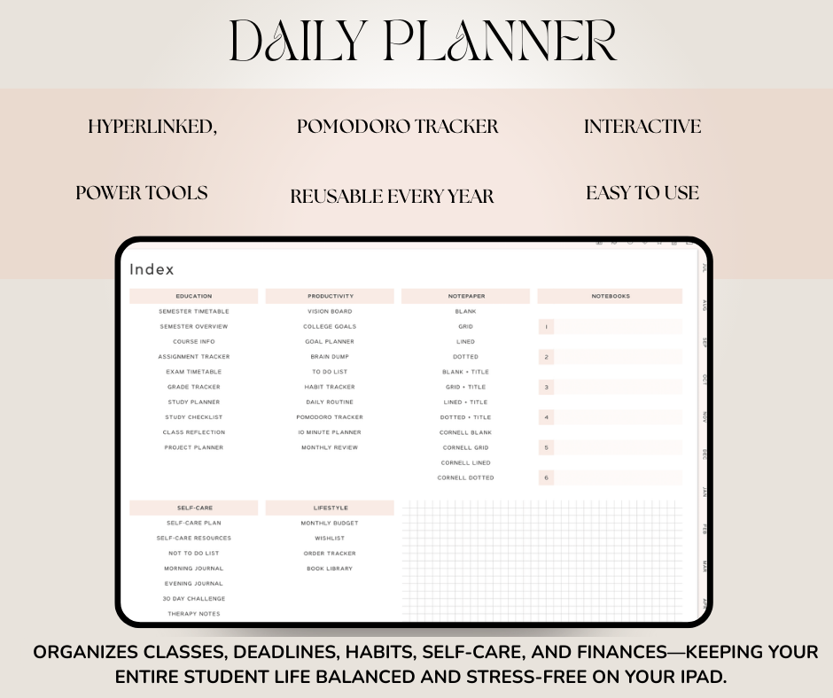 Stay ahead of deadlines, boost your productivity, and create balance in your student life with the 2025–2026 Digital Student Planner. Designed for ambitious students, this planner combines academic management, productivity systems, self-care tools, and lifestyle trackers in one sleek digital format.