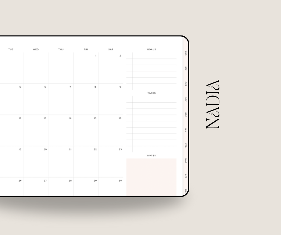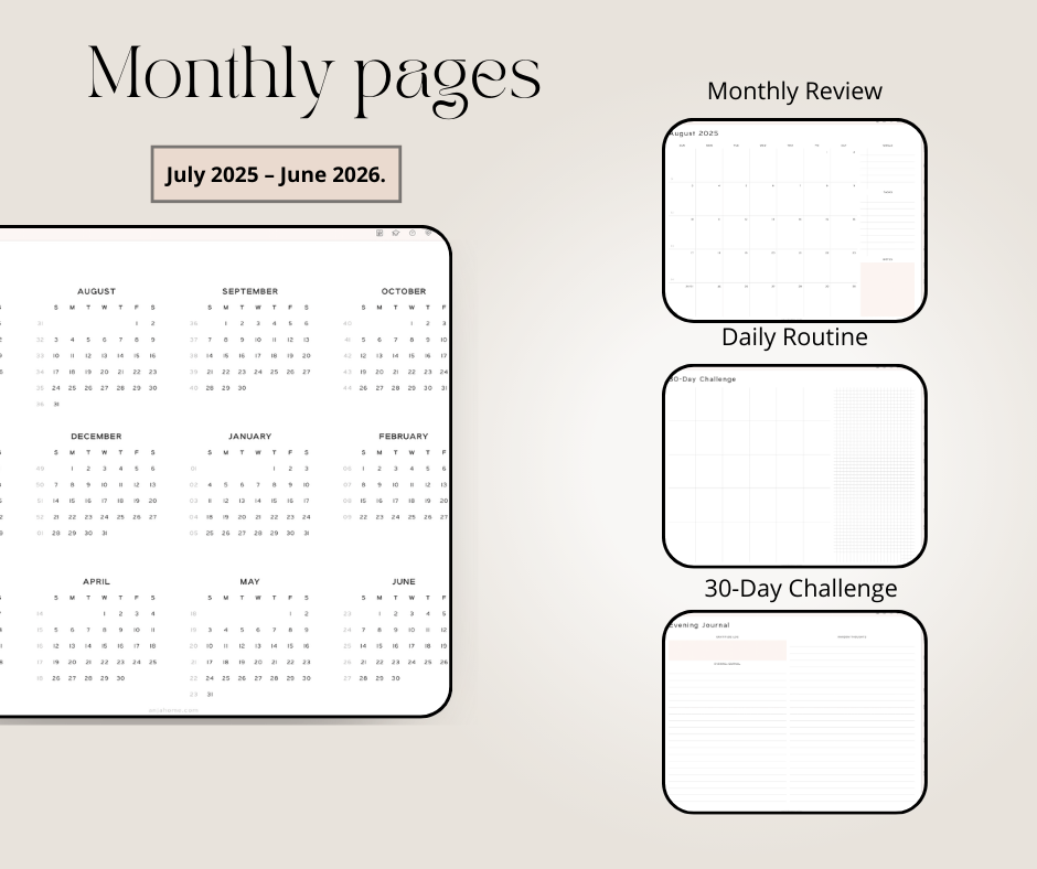 • Monthly Calendars – Space for goals, tasks, and notes alongside each month.
