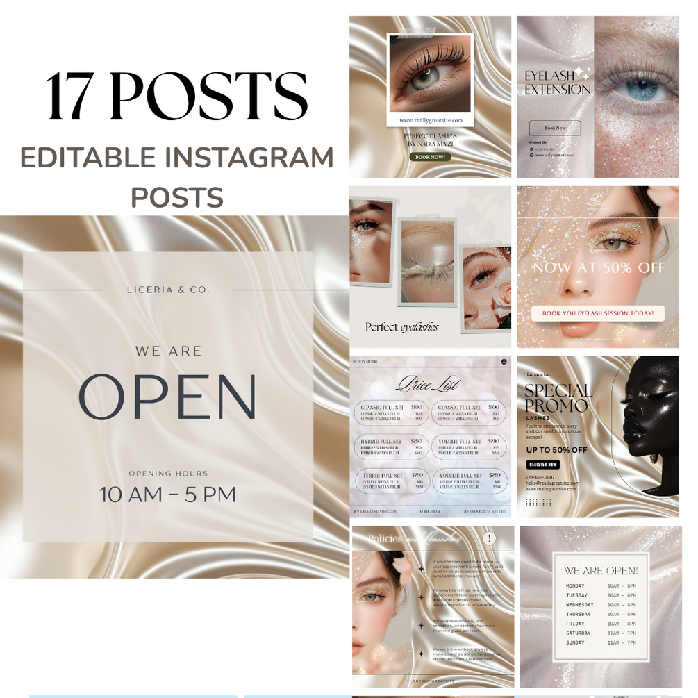 Elevate your Instagram game with 17 stunning, super-chic posts designed especially for lash artists and beauty pros. These gorgeous, shimmering templates feature a dazzling paillette theme that sparkles just like your lash extensions! 💫