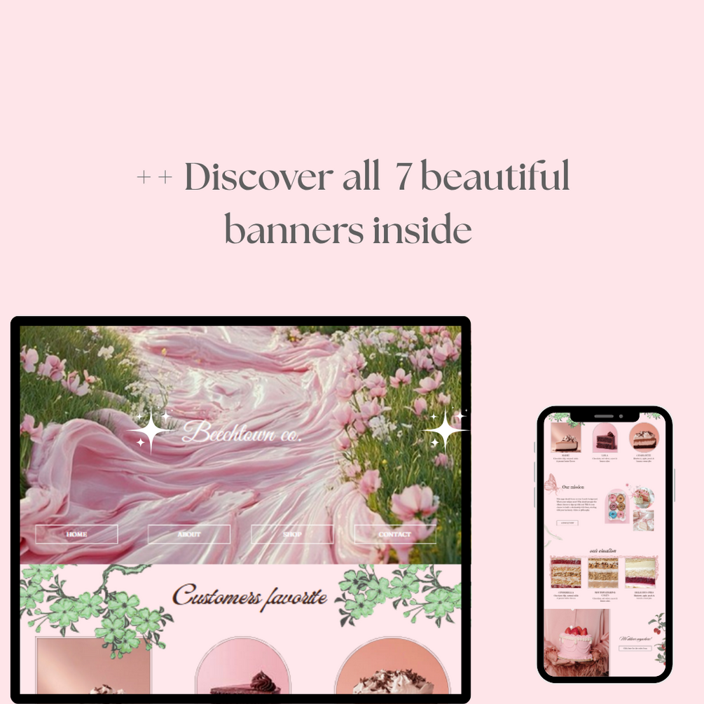 Welcome your customers with the sweet charm of Rococo-inspired design! This set of 7 customizable Canva website banners is perfect for bakery brands, cake shops, and dessert creators looking to showcase their delicious offerings in a soft pink, vintage-chic aesthetic. Fully editable, no design experience needed.