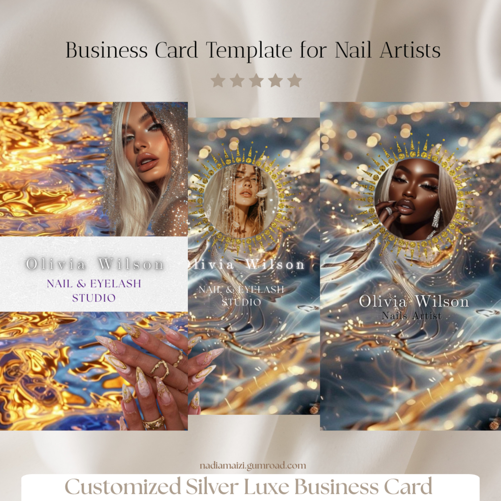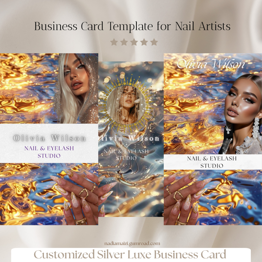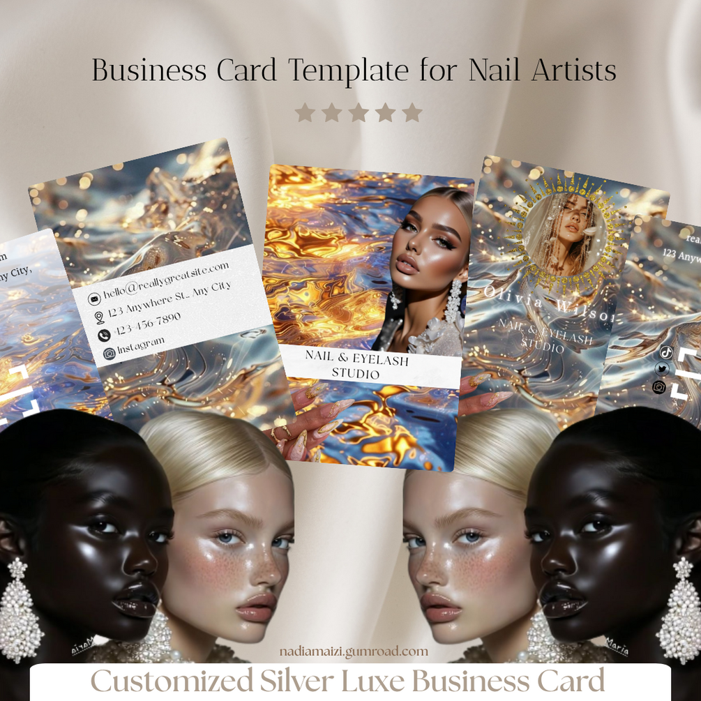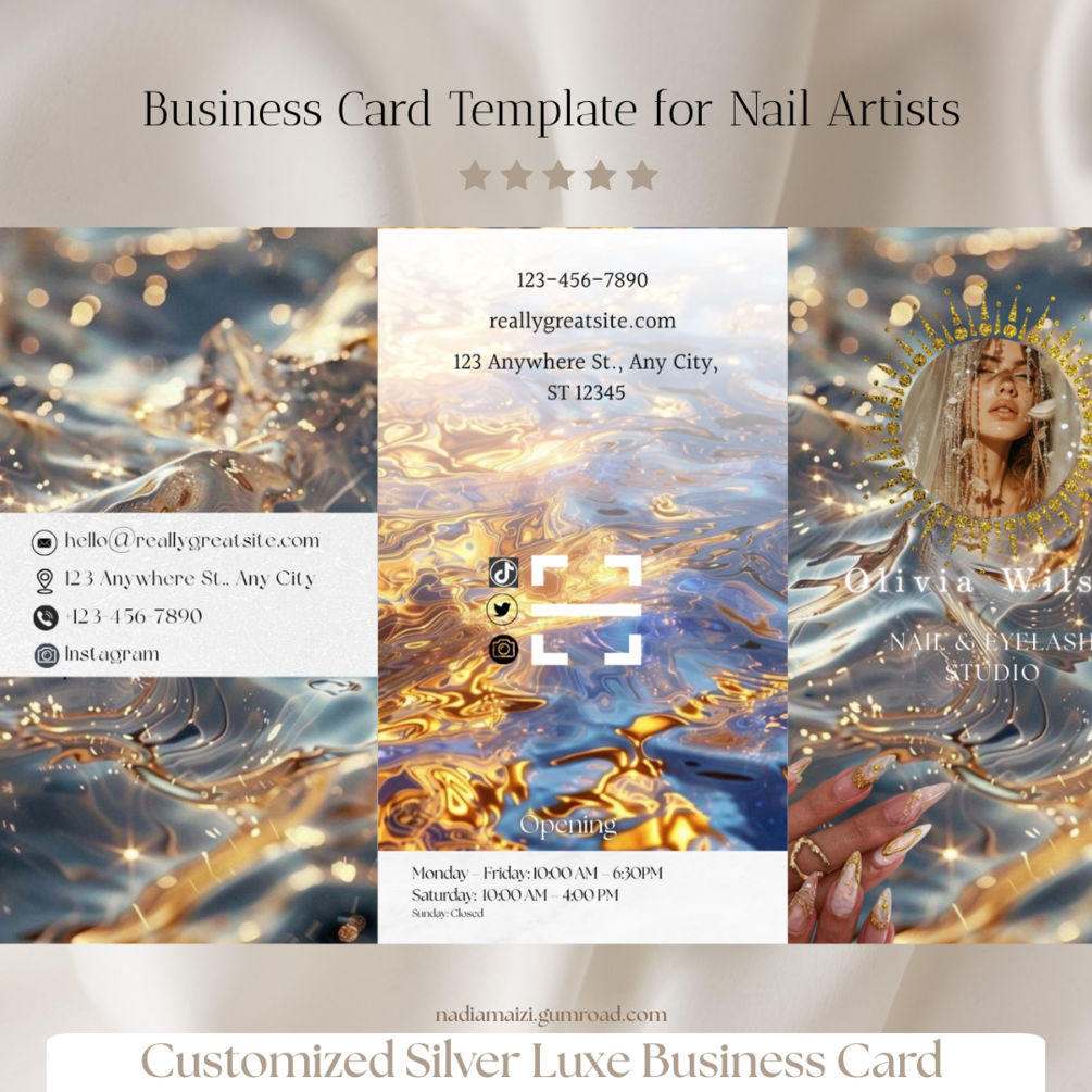 This elegant and modern business card pack is designed especially for nail salons and nail artists who want to stand out with a chic, ocean-inspired luxury style. Think shimmering silver tones, mermaid vibes, and minimalist sophistication — perfect for beauty professionals who value high-end aesthetics.